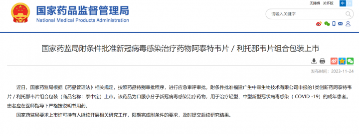 国家药品监督管理局(NMPA)发布公告,福建广生堂药业旗下创新药控股子公司广生中霖申报的具有全球自主知识产权的抗新冠病毒创新药阿泰特韦片/利托那韦片组合包装(商品名:泰中定®)上市,用于轻中度新型冠状病毒感染(COVID-19)的成年患者。泰中定®是广谱口服小分子抗新冠病毒药物, 属于3CL蛋白酶抑制剂。